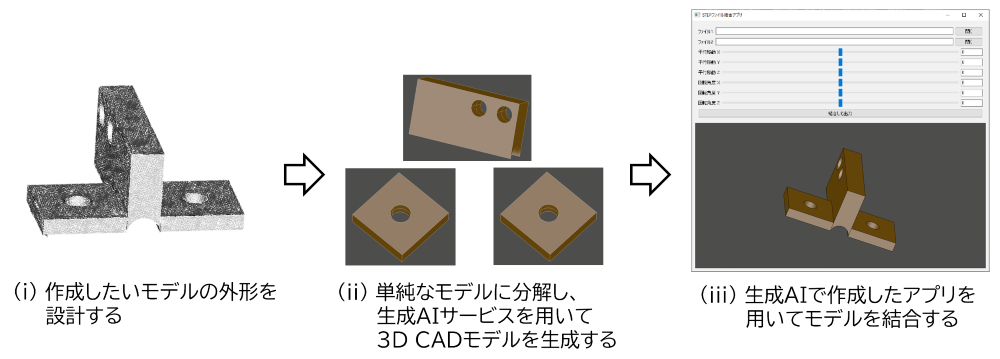 一つ目は3D CADモデリング未経験者を対象とした事例です。3D CADモデリングはモデリングソフトのライセンス費用や習得時間が課題になります。そこで、外形や寸法が決まっていて強度や寸法精度を問わないという前提で、生成AIサービスと自作アプリを用いて3D CADモデルの作成が実現できるかを確認しました。図1で示すように、生成AIサービスでは単純形状しか生成できないため、自作アプリでは、単純形状モデルを結合・型抜き・重なり抽出を行い、複雑形状に再構成します。この一連の手順でモデリングソフトを使用せずに3D CADモデルの作成が可能であることを確認できました。