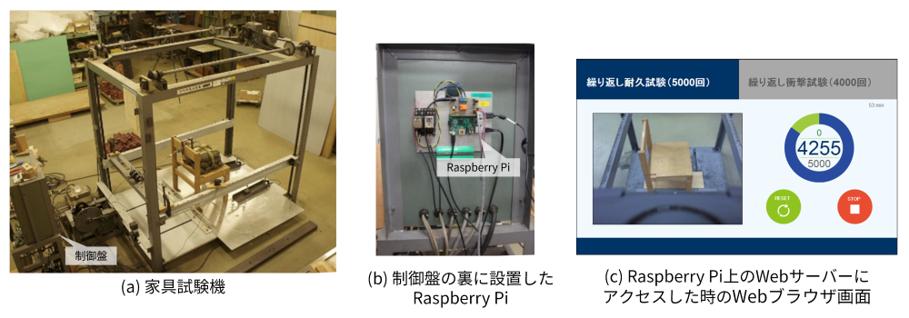 二つ目は、生成AIサービスを用いて、非IT技術者がIoTシステム開発に挑戦する取り組みです。本取り組みでは、初心者でも分かりやすい文章で受け答えができるようにカスタマイズした生成AIサービスを用意しました。図2のように、家具試験機モニタリングシステムは、家具の耐久性などを試験する家具試験機を監視するIoTシステムであり、Raspberry Piと家具試験機が接続され、Webブラウザ上に試験映像やカウンター等が表示されるシステムで、KISTECの家具試験で実際に使用しています。生成AIに繰り返し質問を行うことで、非IT技術者でも既存システムに家具の移動量データの取得機能を追加することができました。この取り組みを通じて、IoTシステム開発では、内容理解や疑問点を文章で正確に伝えることも重要であると同時に、回路接続図やデータフロー図、開発中のWeb画面などの視覚情報を併せて提示することで、より正確で効率的な開発に寄与することが分かりました。
