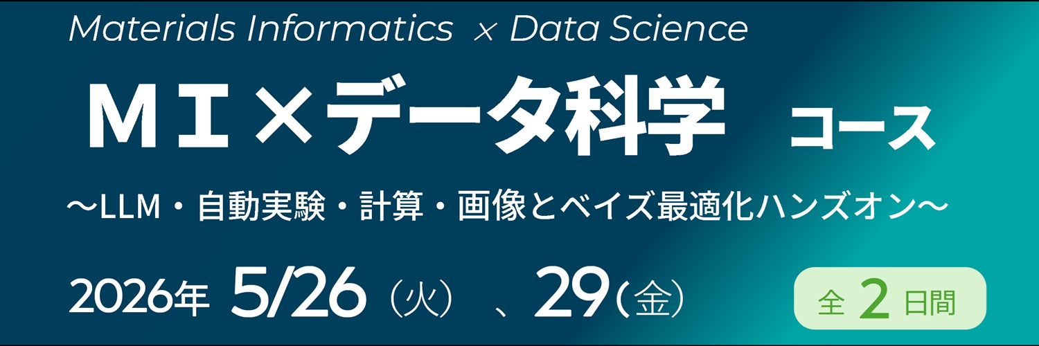 これまで、「MI×データ科学」コースでは3年にわたり、物理・化学・薬学・測定・計算科学などさまざまな分野でデータ科学がどのように利用され、どのような成功例が得られてきたかを概観してきました。この3年間で取り扱ってきた話題のうち、より発展性のあるテーマを厳選、さらに、近年注目を集めている生成AIおよび自動自律実験と材料研究の接点に関する話題も提供します。新進気鋭の若手研究者にそれぞれの分野におけるデータ科学の有効性を、各論に深入りせずに概観してもらうことにより、参加者が行いたい研究・開発の道筋が明確化すると期待しています。各コマでそれぞれの話が閉じるように設定されているため、過去3年の受講者、新規受講者どちらにも有用であると考えています。また、新しい取り組みとして、ベイズ最適化のハンズオンを実施します。扱うベイズ最適化手法は、Windowsコンピュータ上で動くアプリケーションとして提供し、Python等の事前知識は必要ない状態で行えます。