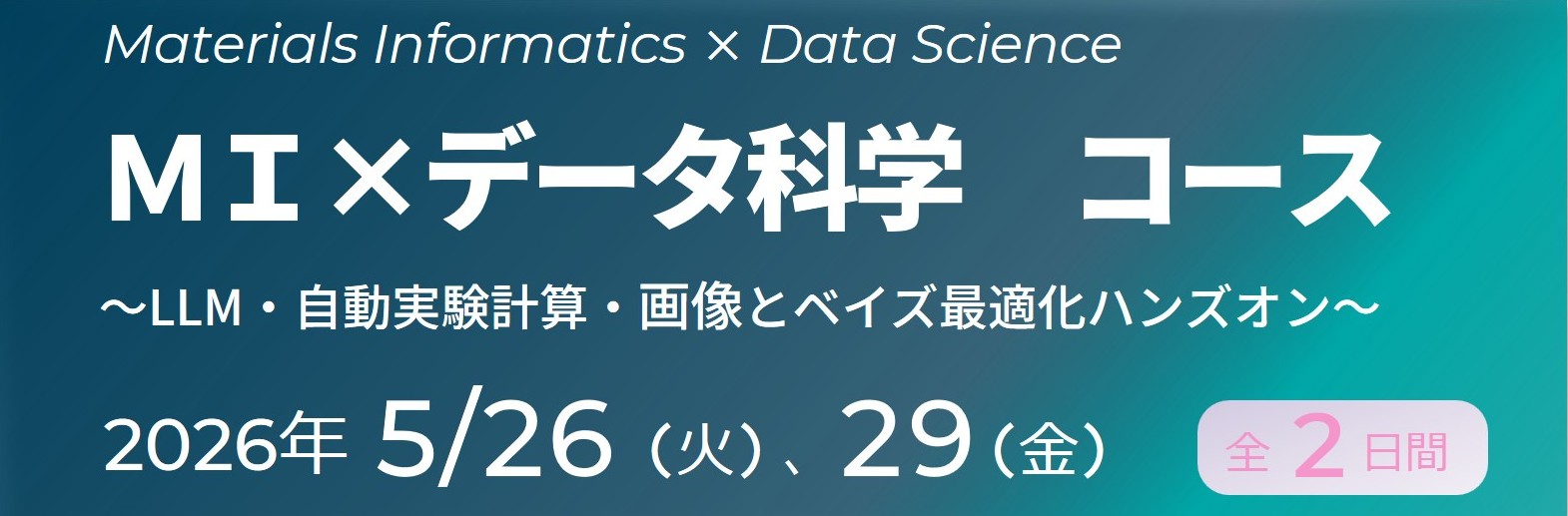 これまで、「MI×データ科学」コースでは3年にわたり、物理・化学・薬学・測定・計算科学などさまざまな分野でデータ科学がどのように利用され、どのような成功例が得られてきたかを概観してきました。この3年間で取り扱ってきた話題のうち、より発展性のあるテーマを厳選、さらに、近年注目を集めている生成AIおよび自動自律実験と材料研究の接点に関する話題も提供します。新進気鋭の若手研究者にそれぞれの分野におけるデータ科学の有効性を、各論に深入りせずに概観してもらうことにより、参加者が行いたい研究・開発の道筋が明確化すると期待しています。各コマでそれぞれの話が閉じるように設定されているため、過去3年の受講者、新規受講者どちらにも有用であると考えています。また、新しい取り組みとして、ベイズ最適化のハンズオンを実施します。扱うベイズ最適化手法は、Windowsコンピュータ上で動くアプリケーションとして提供し、Python等の事前知識は必要ない状態で行えます。