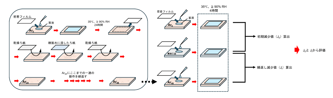 本試験ではサンプル表面に付着した菌を繰り返し拭き取った後も、菌に対するサンプルの効果が持続・維持される性質(繰返し除菌性)を評価します。
